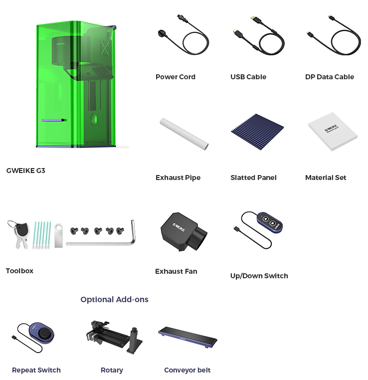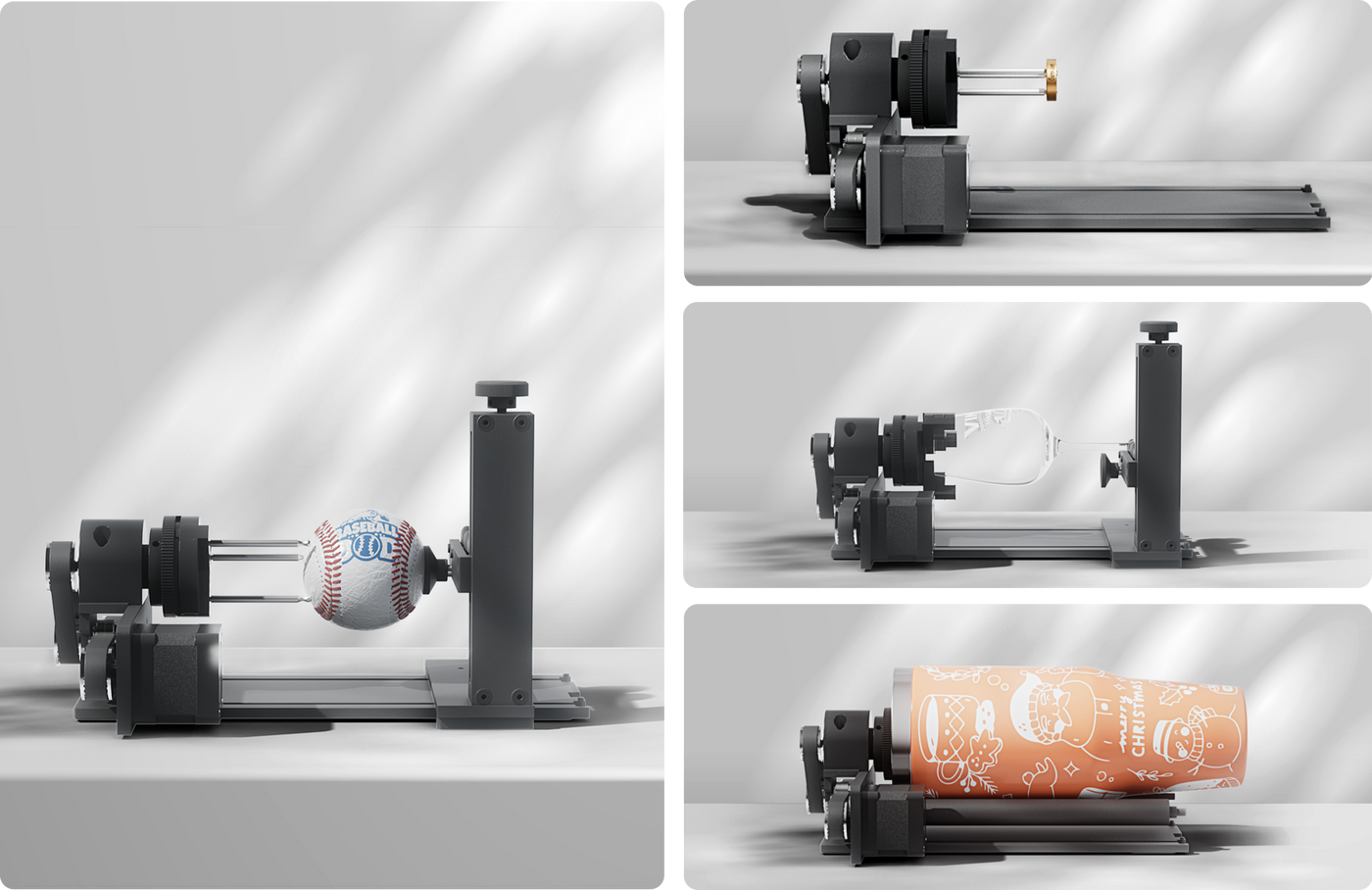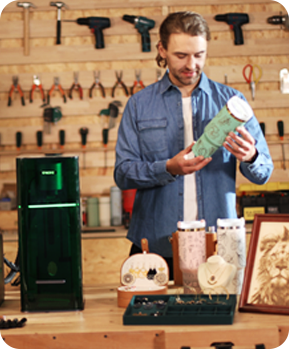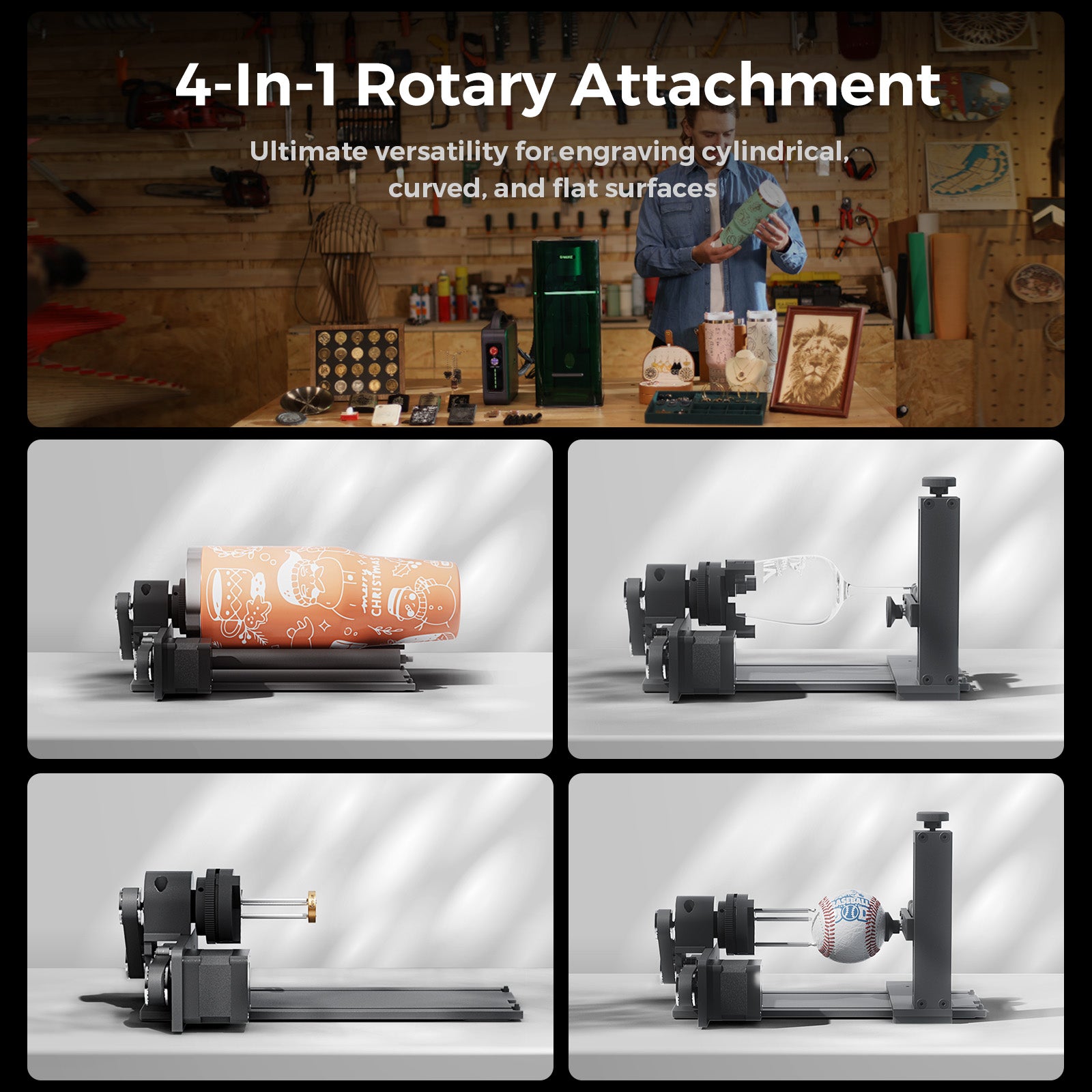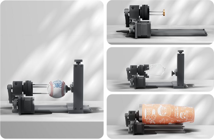 Featuring an innovative 4-in-1 rotary axis, it supports engraving on most common cylindrical and spherical objects — including tumblers, mugs, ornament balls, rings, and more — with ease.